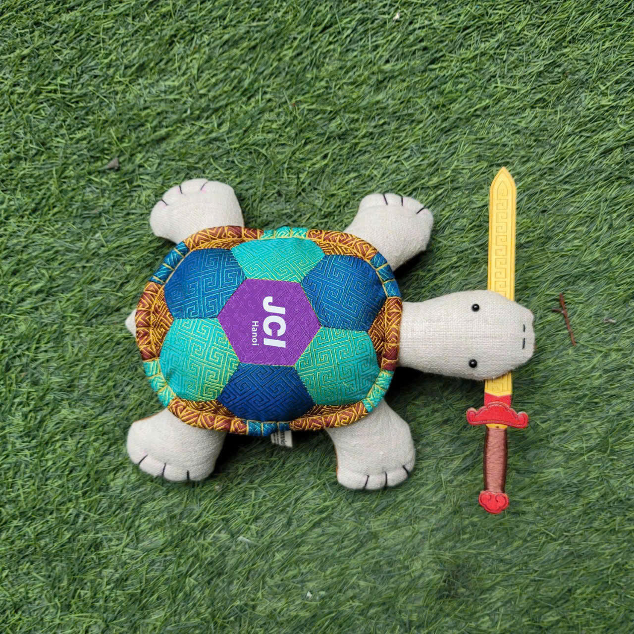 Chiếc ghim cài áo bằng gỗ, hình rùa ngậm kiếm kèm biểu tượng chính thức của Hà Nội, được lấy cảm hứng từ truyền thuyết Hồ Gươm – nơi Rùa Thần hoàn kiếm, biểu trưng cho hòa bình và sự đoàn kết. Đây là hình ảnh mang đậm dấu ấn lịch sử và tinh thần kiên cường của dân tộc Việt Nam.